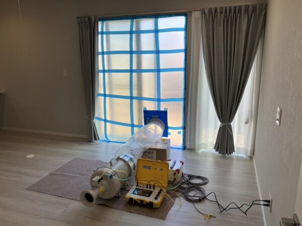高気密を謳う住宅会社には欠かせない全棟気密測定を実施。