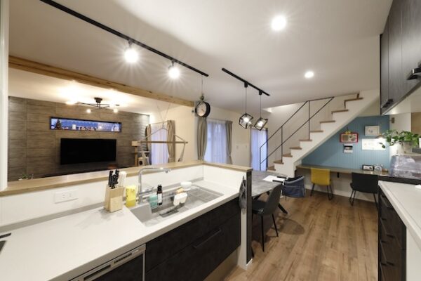 キッチンに立った時に真っ直ぐ見渡せるLDKを計画。玄関ホールから入る際に、左右の抜け感が活かされるような位置にドアを設計しました。更にTVの左右に収納を設ける事で、収納の確保と奥行き感の両立とこだわりをプラスしました。