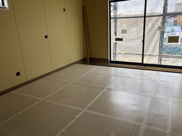 傷や汚れを防ぐために、フローリング施工後は床養生を行います。