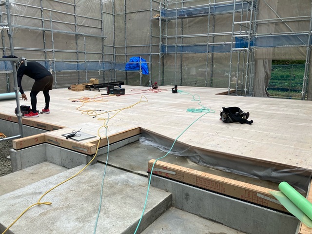1階の床伏せ工事が終わり、いよいよ建方工事が始まります。