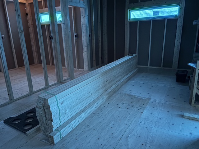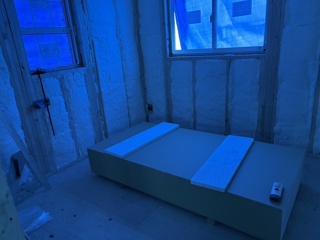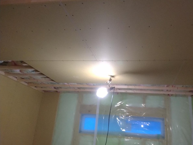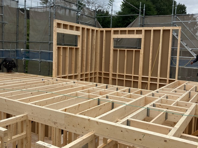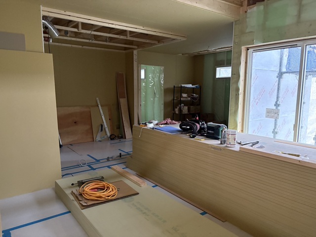 断熱材の上に気密を上げるための気密シートの施工が行われ、石膏ボードを貼って壁ができてきています。