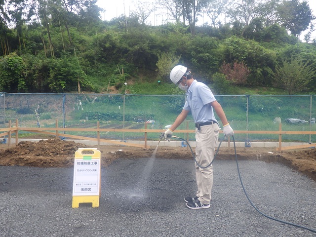 建物の建築場所の土壌に防蟻の薬剤を散布しました。