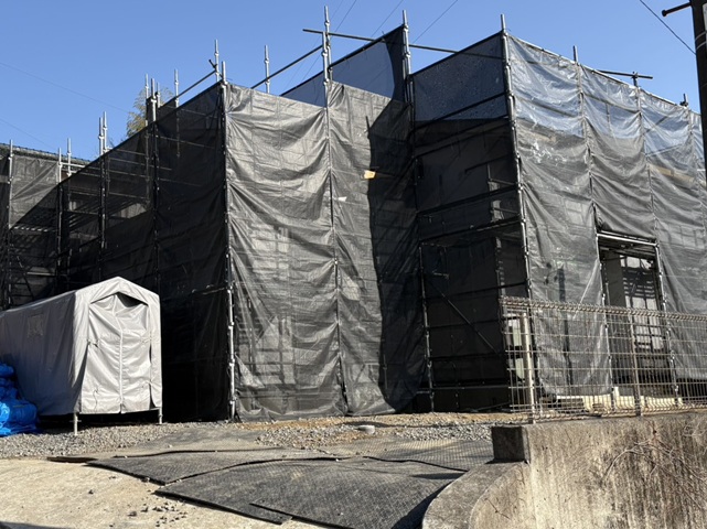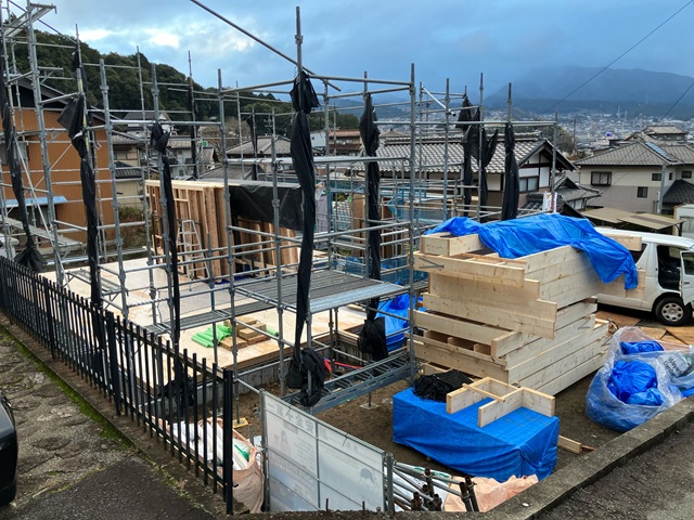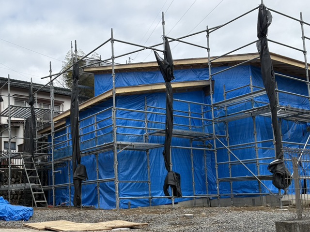 足場が組まれ、1階の床伏せ工事が終わっています。