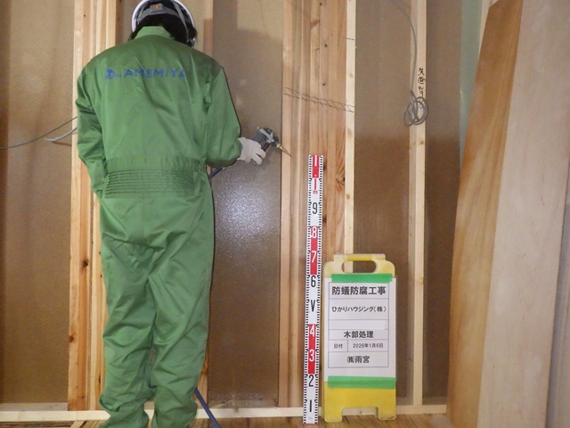 床下、水回り、玄関回りなどの面材部に防蟻・防腐の薬剤を散布しました。