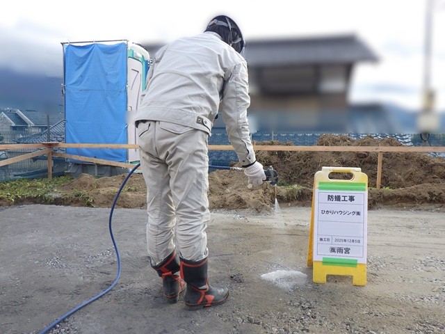 基礎の下になる土壌に防蟻の薬剤を散布しました。