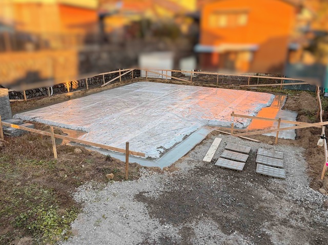 捨てコンクリートを流し、この後基礎の型枠を組んでいきます。