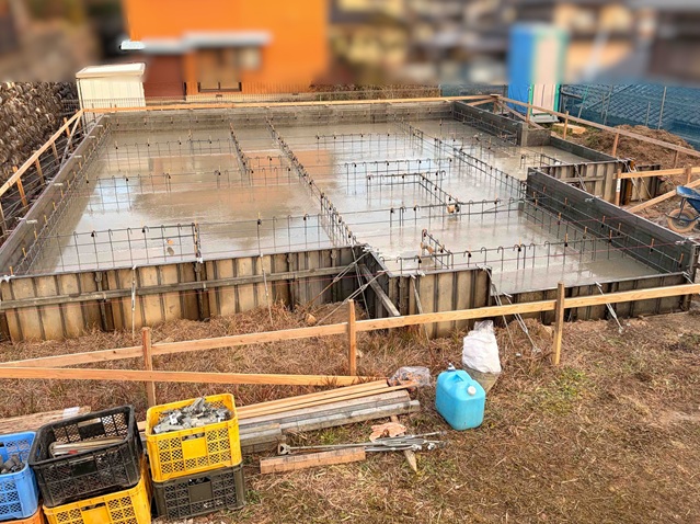 検査をクリアし、土台部分のコンクリートを流し入れました。