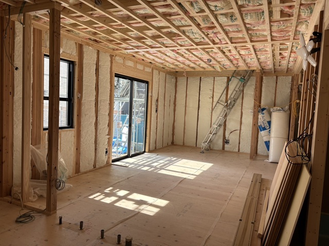 外壁の防水シートの施工が行われ、第三者機関による施工検査を受けます。