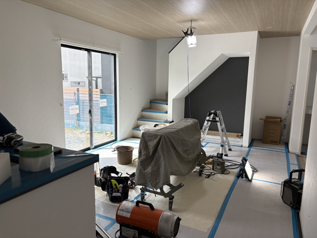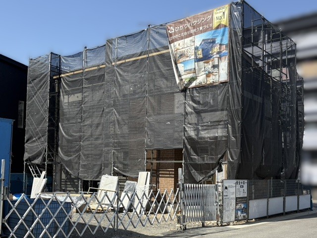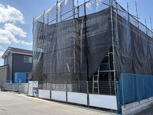 足場ネットでわかりにくいですが、外壁工事が進んでいます。