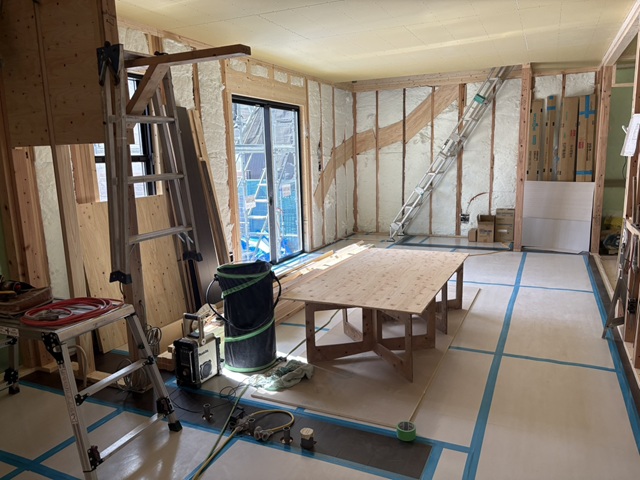 サッシの取り付けも完了し、外壁の防水シートの施工が行われています。