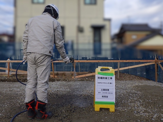 建築予定の土壌に防蟻の薬剤を散布しました。