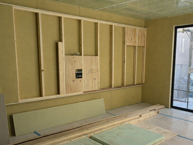 壁掛けテレビやエアコンなどの取り付け位置には下地を施工しています。