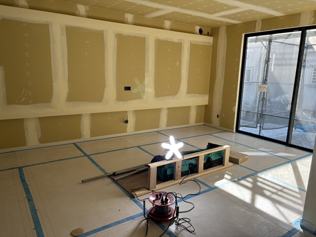 サッシの取り付け・電気配線工事など内部の工事も進んでいます。