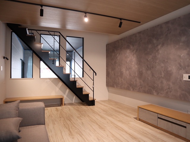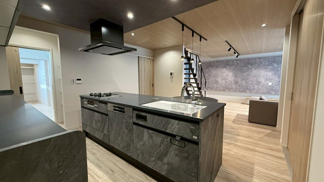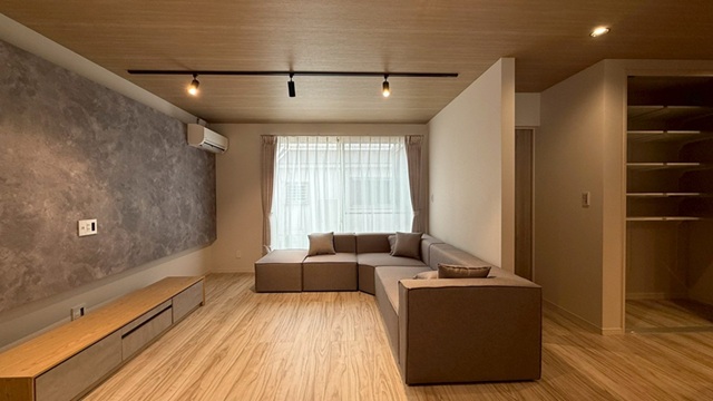 照明も控えめで、落ち着いた色味のLDK空間が仕上がりました。