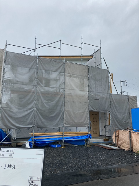 上棟後、外部の防水シートが施工されるまではブルーシートでしっかりと雨対策を行います。