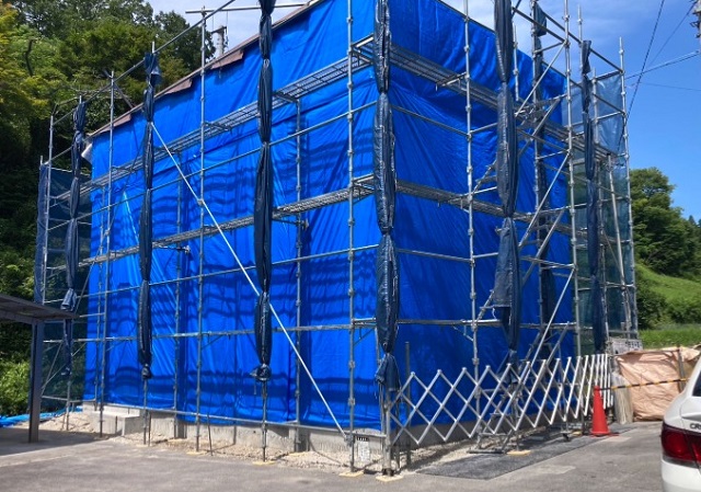 この後、雨樋などの取り付け工が行われるため足場が解体されるのはまだ少し先になります。